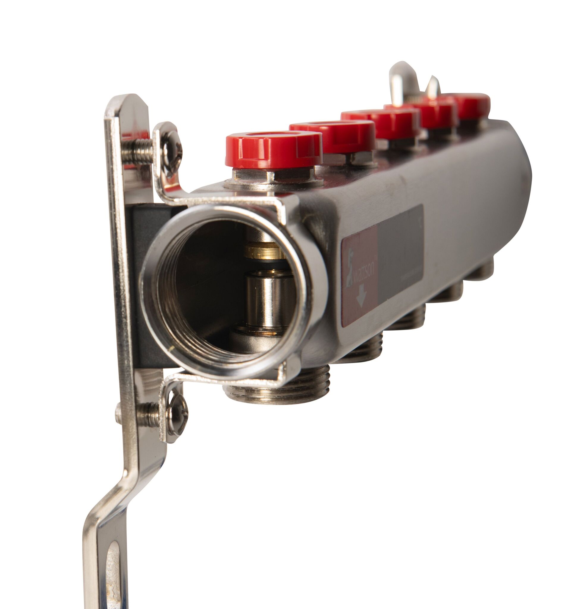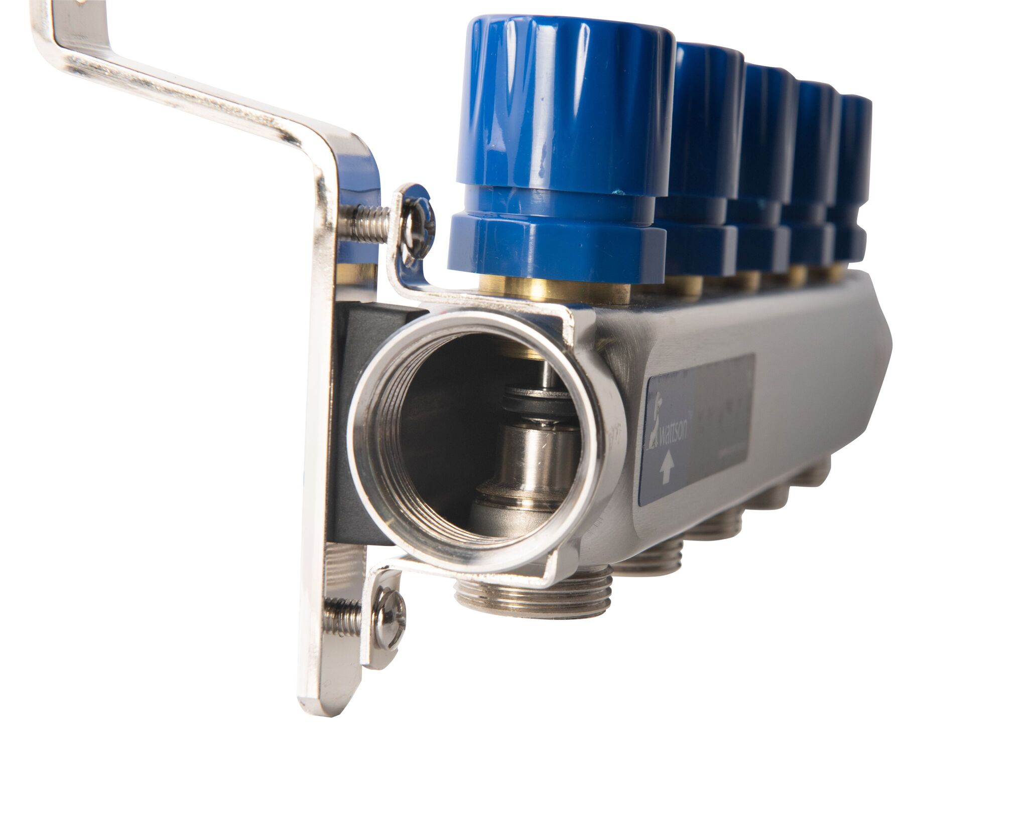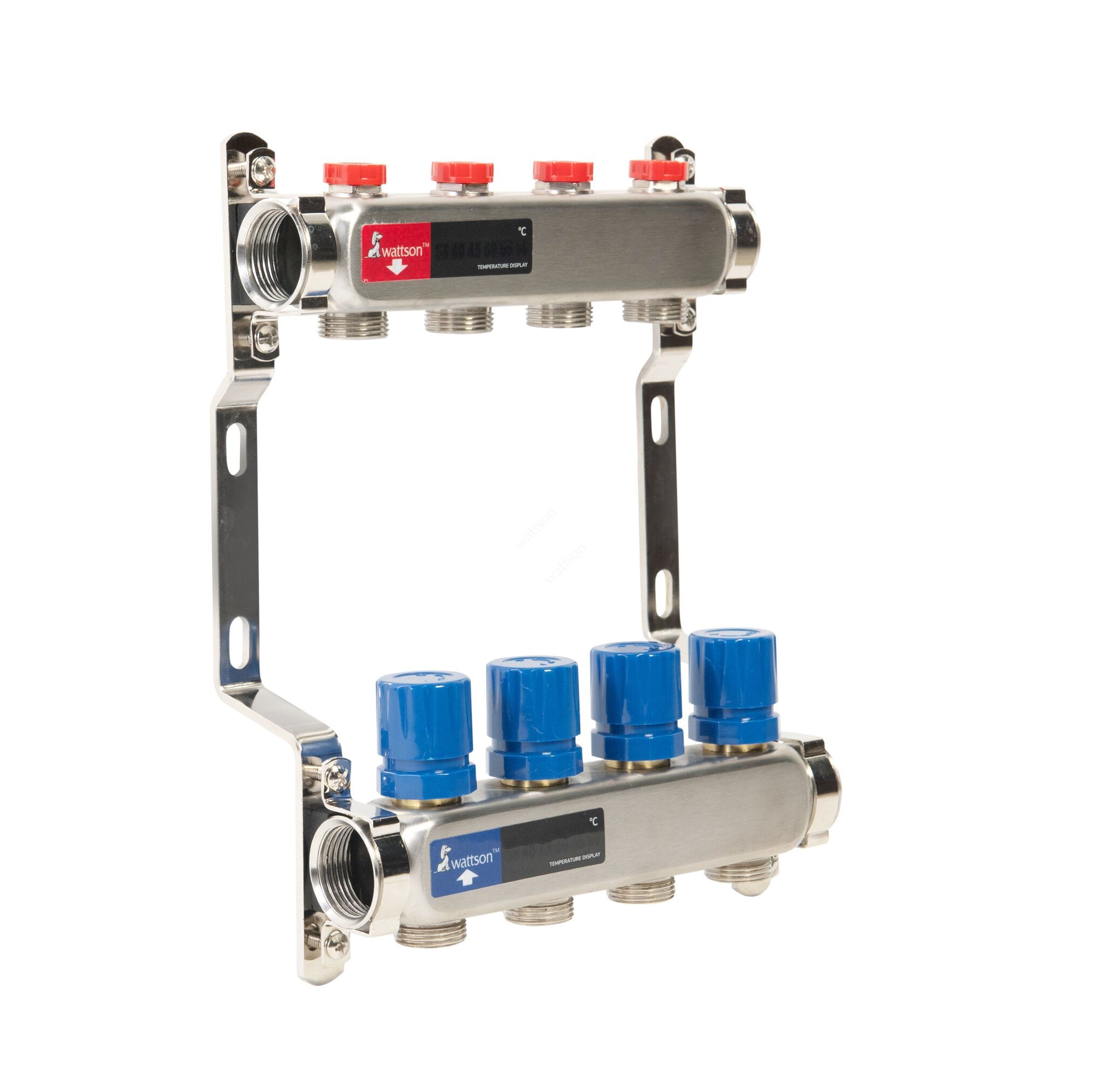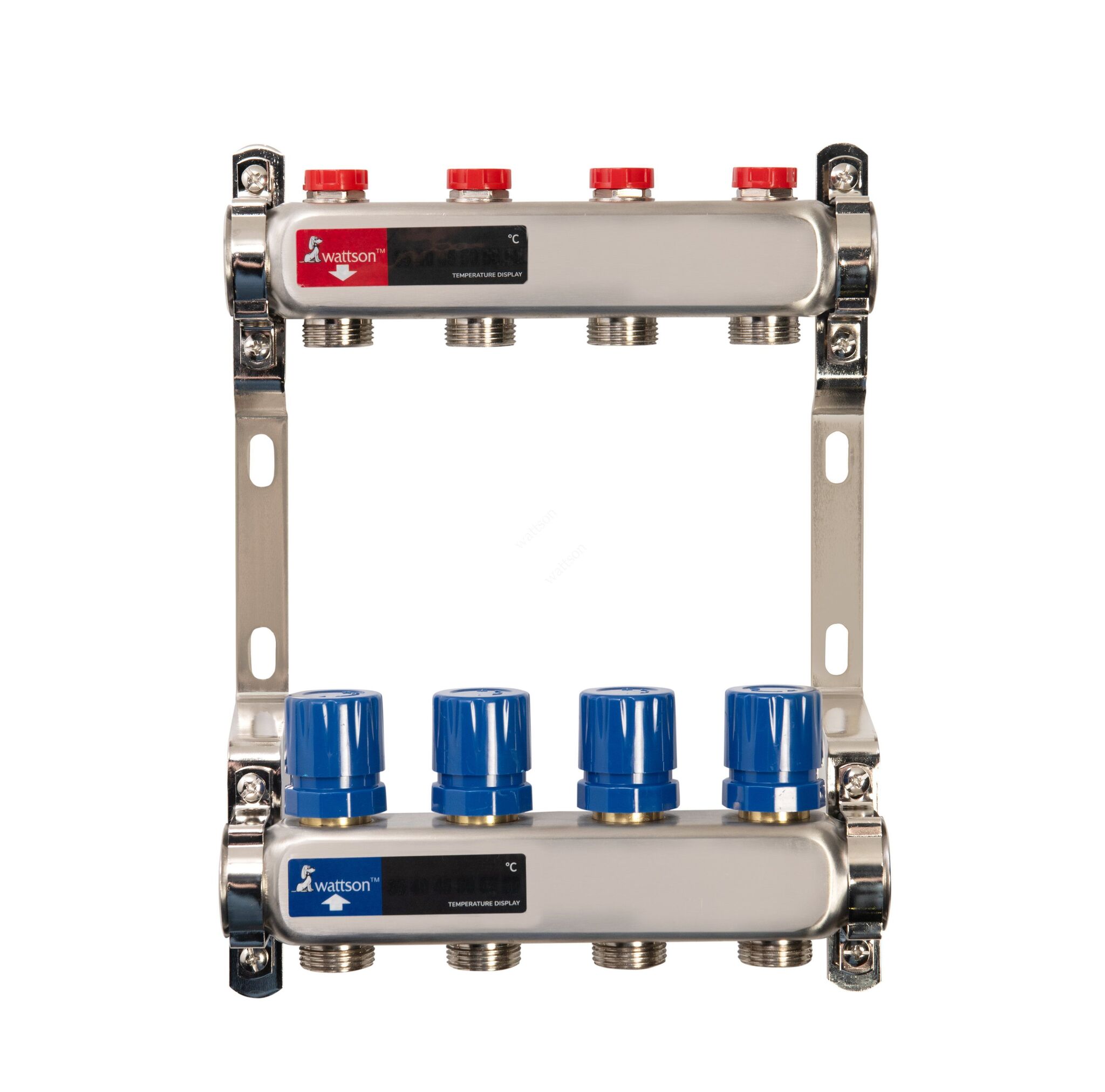Распределительный коллектор Wattson на 4 выхода. Изготовлен из нержавеющей стали с балансировочными вентилями на подающем коллекторе и термостатическими вентилями на обратном коллекторе. Термометры расположены на подающем и обратном коллекторе. Кронштейн в комплекте. Максимальное рабочее давление: 10 бар. Рабочая температура: от +5°C до +90°C.