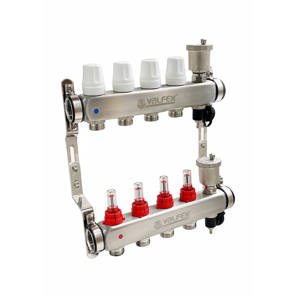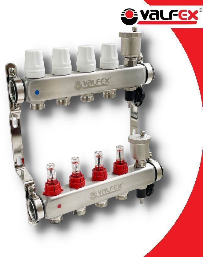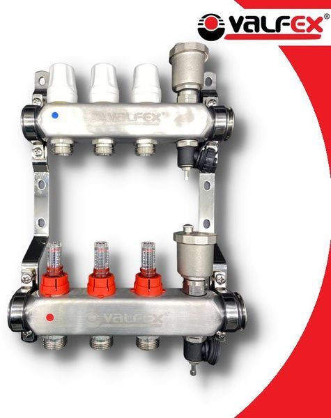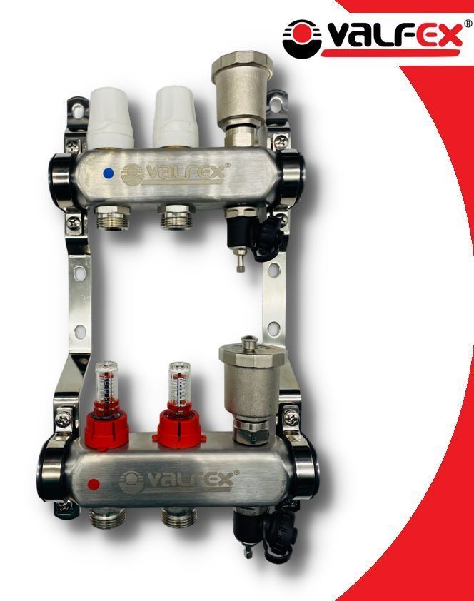 Коллекторная группа из нержавеющей стали со встроенными расходомерами и регулирующими клапанами ТМ VALFEX – позволяет производить балансировку петель при включенном циркуляционном насосе с помощью настроечных клапанов без фиксации, с расходомерами. В комплекте имеются автоматические воздухоотводчики, позволяющие удалять из системы накопление воздуха и газов.