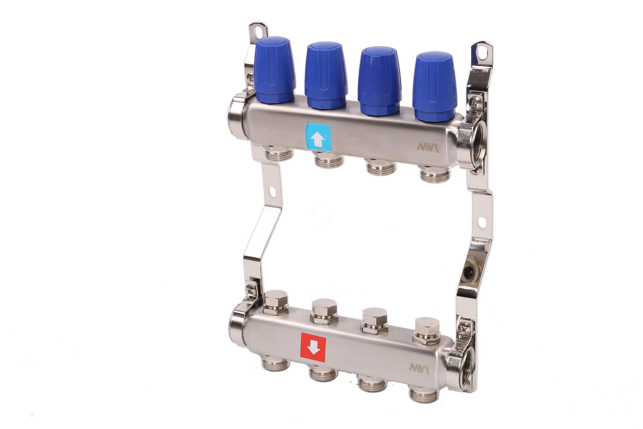 Коллектор из нержавеющей стали для теплого пола в сборе MVI Применяется для распределения потоков жидкостей в контурах радиаторного отопления, холодного и горячего водоснабжения. Характеризуется большим, чем у латунных аналогов, проходным сечением, что способствует нормальному выравниванию давления для подключенных потребителей. Межосевое расстояние отводящих патрубков – 50 мм. Резьба патрубков – наружная, стандарт присоединения – 3/4" «евроконус». Число отводящих патрубков – от 2 до 12. Резьба коллектора – внутренняя, 1". Коллектор из нержавеющей стали MVI рассчитан на рабочее давление до 10 бар и максимальную температуру рабочей среды 130 °С. Средний полный срок службы изделия – 50 лет.