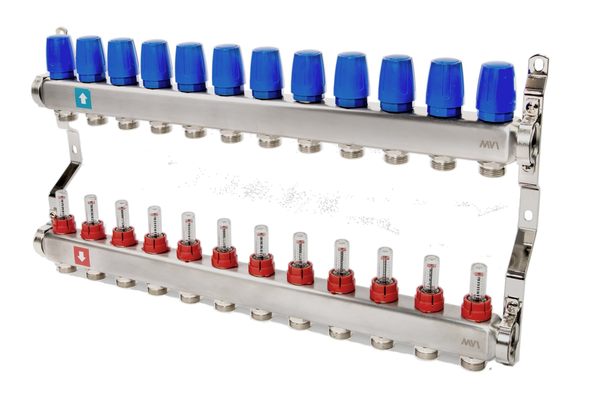 Коллектор из нержавеющей стали для теплого пола в сборе MVI Применяется для распределения потоков жидкостей в контурах радиаторного отопления, холодного и горячего водоснабжения. Характеризуется большим, чем у латунных аналогов, проходным сечением, что способствует нормальному выравниванию давления для подключенных потребителей. Межосевое расстояние отводящих патрубков – 50 мм. Резьба патрубков – наружная, стандарт присоединения – 3/4" «евроконус». Число отводящих патрубков – от 2 до 12. Резьба коллектора – внутренняя, 1". Коллектор из нержавеющей стали MVI рассчитан на рабочее давление до 10 бар и максимальную температуру рабочей среды 130 °С. Средний полный срок службы изделия – 50 лет.