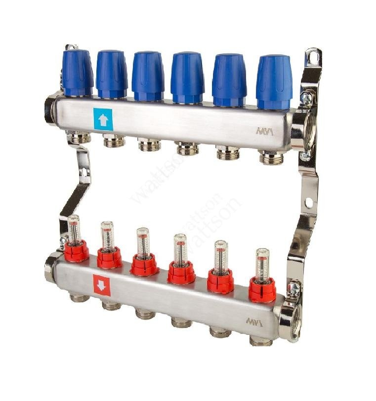 Коллектор из нержавеющей стали для теплого пола в сборе MVI Применяется для распределения потоков жидкостей в контурах радиаторного отопления, холодного и горячего водоснабжения. Характеризуется большим, чем у латунных аналогов, проходным сечением, что способствует нормальному выравниванию давления для подключенных потребителей. Межосевое расстояние отводящих патрубков – 50 мм. Резьба патрубков – наружная, стандарт присоединения – 3/4" «евроконус». Число отводящих патрубков – от 2 до 12. Резьба коллектора – внутренняя, 1". Коллектор из нержавеющей стали MVI рассчитан на рабочее давление до 10 бар и максимальную температуру рабочей среды 130 °С. Средний полный срок службы изделия – 50 лет.