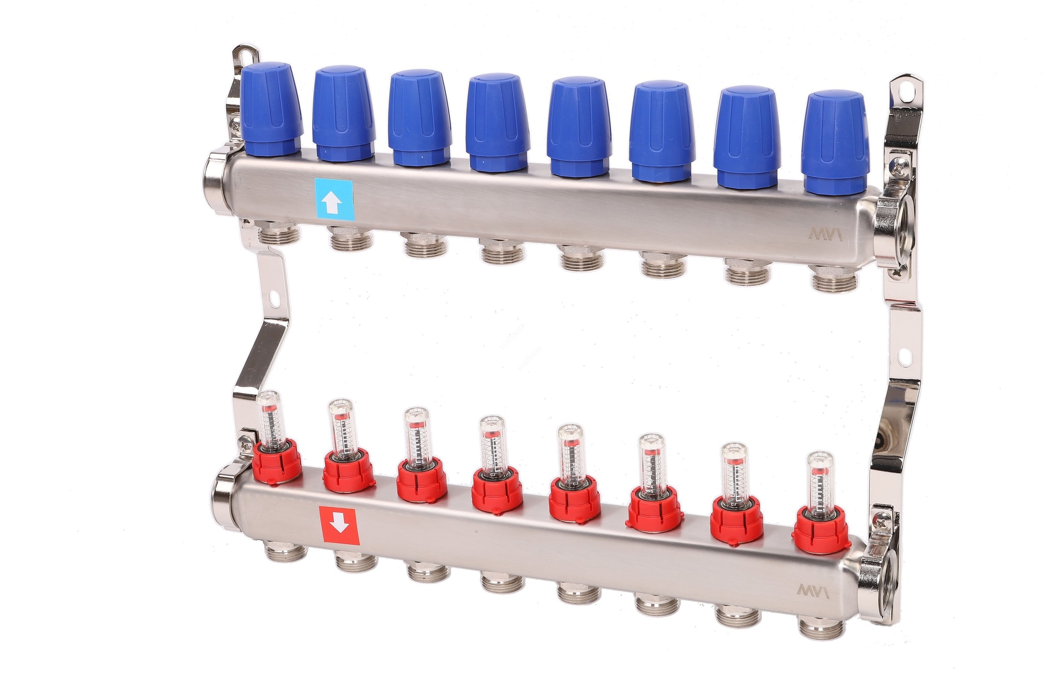 оллектор из нержавеющей стали для теплого пола в сборе MVI Применяется для распределения потоков жидкостей в контурах радиаторного отопления, холодного и горячего водоснабжения. Характеризуется большим, чем у латунных аналогов, проходным сечением, что способствует нормальному выравниванию давления для подключенных потребителей. Межосевое расстояние отводящих патрубков – 50 мм. Резьба патрубков – наружная, стандарт присоединения – 3/4" «евроконус». Число отводящих патрубков – от 2 до 12. Резьба коллектора – внутренняя, 1". Коллектор из нержавеющей стали MVI рассчитан на рабочее давление до 10 бар и максимальную температуру рабочей среды 130 °С. Средний полный срок службы изделия – 50 лет.