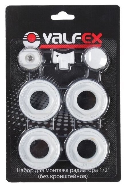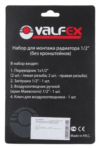 Комплекты для монтажа радиаторов VALFEX предназначены для монтажа алюминиевых и биметаллических радиаторов с присоединительным размером верхнего и нижнего коллекторов 1" (внутренняя резьба). В состав комплекта включены четыре футорки 1 x 1/2’’ – две правые и две левые, одна заглушка 1/2", один воздухоотводчик ручной (кран Маевского) 1/2", один ключ для воздухоотводчика