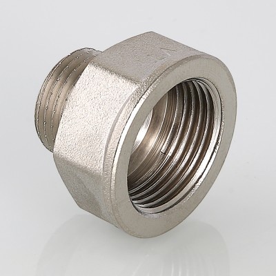(VTr.592.N) Назначение фитинга – переход с внутренней резьбы на наружную (больший/меньший диаметр). Переходник изготовлен горячим штампованием из латуни CW617N с последующим никелированием. Корпус фитинга – шестигранный – под гаечный ключ. Резьба – трубная цилиндрическая, совместимая с наружной конической по ГОСТу 6211. Номинальное давление – 40/25 бар (для типоразмеров до/более 1”). Максимальное рабочее давление при температуре среды 250 °С – 2,7/1,7 бара. Переходник применим на стальных, медных, латунных, пластиковых, металлопластиковых трубопроводах.