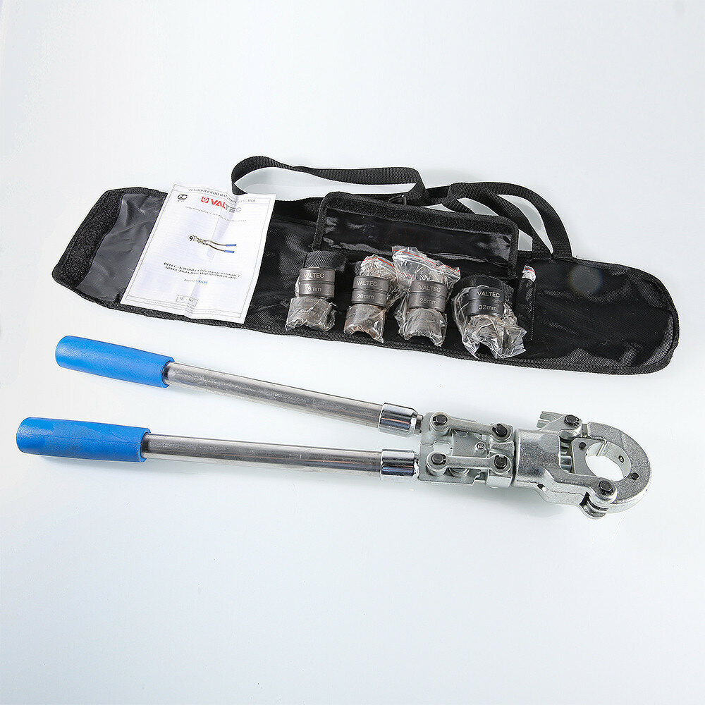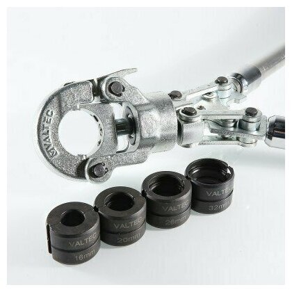 Ручной пресс-инструмент с комплектом насадок 16-20-26-32, стандарт th valtec vtm.293.0.160032 представляет собой радиальные клещи для обжатия вручную пресс-фитингов и труб из полимеров, металлополимеров, меди, а также тонкостенной нержавеющей стали. рабочие диаметры: 16, 20, 26 и 32 мм. усилие обжатия зависит от выбранной длины рукояток и регулируется механизмом пресс-головки, которая дополнительно обладает возможностью вращения относительно рукояток на 360°. вес пресс-инструмента без насадок: 4.76 кг. технические характеристики пресс-инструментов valtec vtm.293.0.160032 габариты, мм длина макс. 900 max диаметр трубы, мм 32 усилие обжатия, кн 57 работа от аккумулятора нет телескопические рукоятки есть насадки в комплекте есть поворот пресс-головки, град 360 тип привода ручной параметры упакованного товара единица товара: штука вес, кг: 4,76 габариты, мм: 1000 x 1000 x 1000 комплектация пресс-клещи; пара пресс-вкладышей дн=16; пара пресс-вкладышей дн=20; пара пресс-вкладышей дн=26; пара пресс-вкладышей дн=32; сумка. произведено италия — родина бренда — страна производства